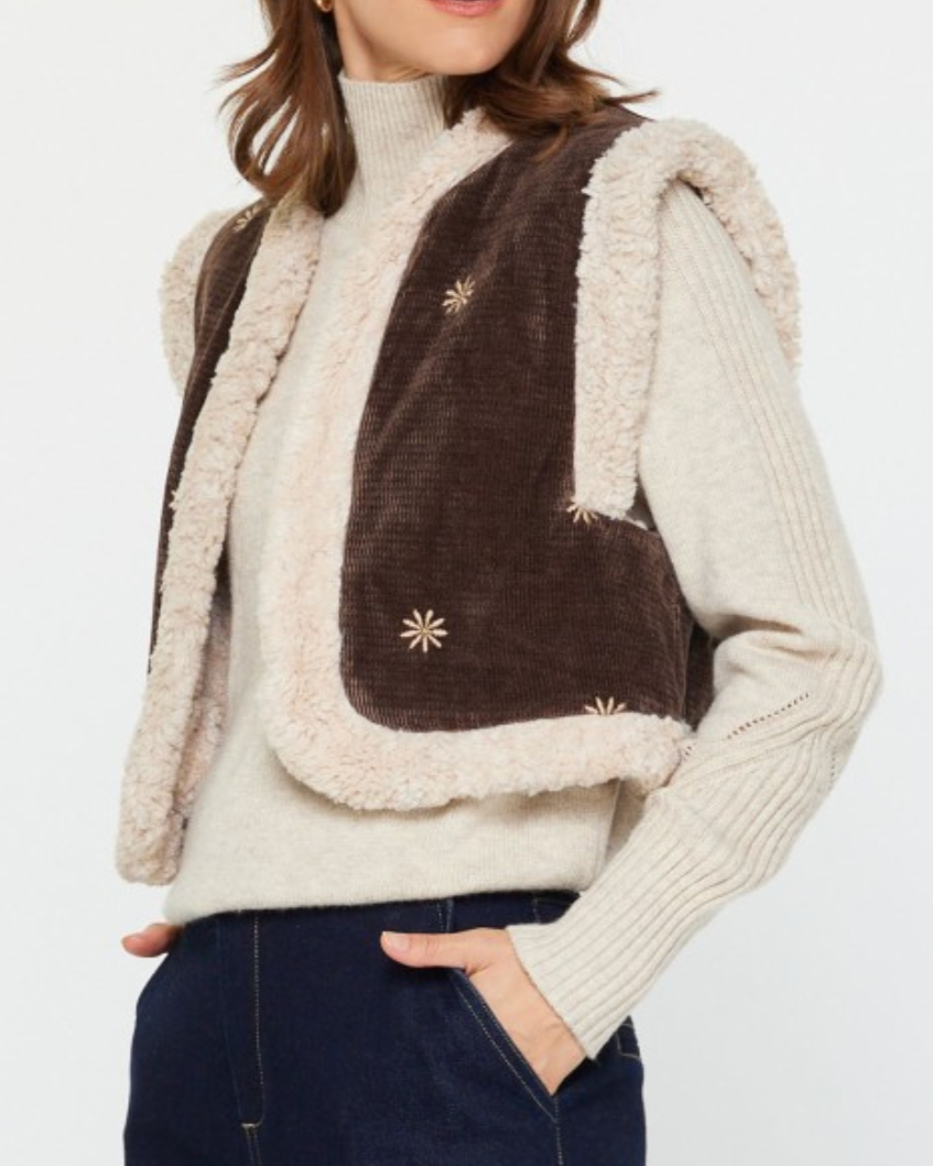 Meet your fall favorite: the Daisy & the six Vest. One side wraps you in cloud-soft faux shearling, the other shows off rich corduroy sprinkled with embroidered daisies. Easy to flip, fun to style, and made for crisp mornings, golden afternoons, and cozy nights out.