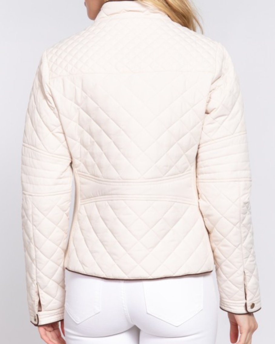 Meet the madison — where timeless design meets modern ease. This quilted jacket brings a sleek, structured fit with diamond stitching that adds just the right touch of polish. The high collar with snap detail, side stretch inset, and zip-front closure keep things streamlined, while contrast piping and side pockets add subtle sophistication. Lightweight yet cozy, it’s the perfect grab-and-go layer for crisp mornings, weekend markets, or an evening out. Effortless. Classic. Confident — just like you.